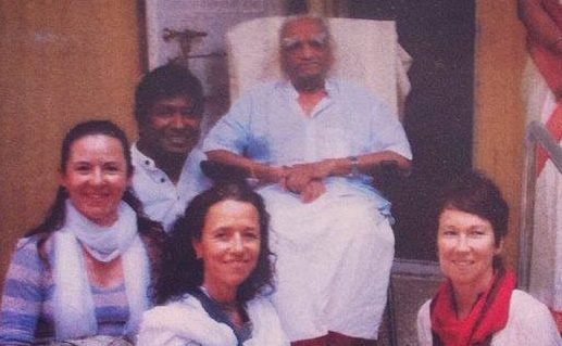 Patricia Awuapara en el Ramamani Iyengar Memorial Institute, en Pune, India, junto al maestro B.K.S. Iyengar y otros estudiantes.